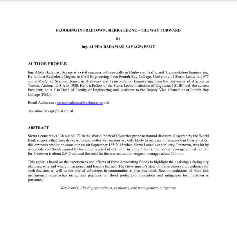 Sierra Leone ranks 138 out of 172 in the World Index of Countries prone to natural disasters. Research by the World Bank suggests that drier dry seasons and wetter wet seasons are only likely to increase in frequency in Coastal cities; this ominous prediction came to pass on September 16th 2015 when Sierra Leone’s capital city, Freetown, was hit by unprecedented floods caused by torrential rainfall of 600 mm in only 5 hours; the normal average annual rainfall for Freetown is about 2,945 mm and the total for the wettest month, August, averages about 790 mm. This paper is based on the experiences and effects of those devastating floods to highlight the challenges facing city planners, why and where it happened and lessons learned. The Government’s state of preparedness and resilience for such disasters as well as the role of volunteers in communities is also discussed. Recommendations of flood risk management approaches using best practices on flood protection, prevention and mitigation for Freetown is presented.