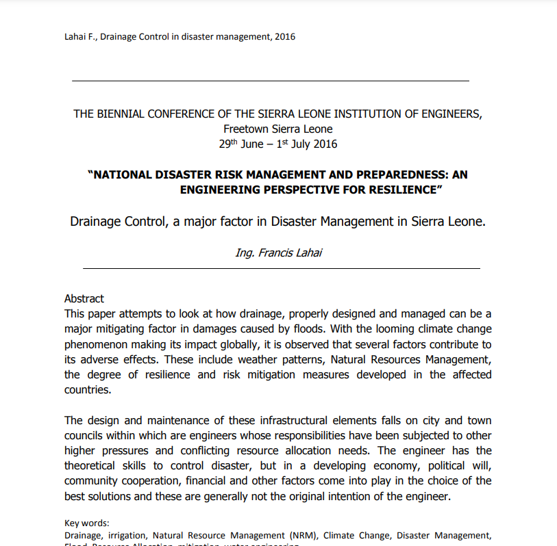 Drainage Control, a major factor in Disaster Management in Sierra Leone. Ing. Francis Lahai This paper attempts to look at how drainage, properly designed and managed can be a major mitigating factor in damages caused by floods. With the looming climate change phenomenon making its impact globally, it is observed that several factors contribute to its adverse effects. These include weather patterns, Natural Resources Management, the degree of resilience and risk mitigation measures developed in the affected countries. The design and maintenance of these infrastructural elements falls on city and town councils within which are engineers whose responsibilities have been subjected to other higher pressures and conflicting resource allocation needs. The engineer has the theoretical skills to control disaster, but in a developing economy, political will, community cooperation, financial and other factors come into play in the choice of the best solutions and these are generally not the original intention of the engineer. Key words: Drainage, irrigation, Natural Resource Management (NRM), Climate Change, Disaster Management, Flood, Resource Allocation, mitigation, water engineering.