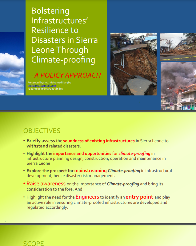 A POLICY APPROACH Presented by:Ing . Mohamed Kargbo mohalpkar@gmail.com +23279026966/+23230386605 OBJECTIVES Briefly assess the soundness of existing infrastructures in Sierra Leone to withstand related disasters. Highlight the importance and opportunities for climate proofing in infrastructure planning design, construction, operation and maintenance in Sierra Leone Explore the prospect for mainstreaming Climate proofing in infrastructural development, hence disaster risk management. Raise awareness on the importance of Climate proofing and bring its consideration to the fore. And Highlight the need for the Engineers to identify an entry point and play an active role in ensuring climate proofed infrastructures are developed and regulated accordingly.