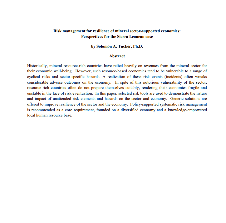 Risk management for resilience of mineral sector-supported economies:Perspectives for the Sierra Leonean case by Solomon A. Tucker, Ph.D. Historically, mineral resource-rich countries have relied heavily on revenues from the mineral sector for their economic well-being. However, such resource-based economies tend to be vulnerable to a range of cyclical risks and sector-specific hazards. A realization of these risk events (incidents) often wreaks considerable adverse outcomes on the economy. In spite of this notorious vulnerability of the sector, resource-rich countries often do not prepare themselves suitably, rendering their economies fragile and unstable in the face of risk eventuation. In this paper, selected risk tools are used to demonstrate the nature and impact of unattended risk elements and hazards on the sector and economy. Generic solutions are offered to improve resilience of the sector and the economy. Policy-supported systematic risk management is recommended as a core requirement, founded on a diversified economy and a knowledge-empowered local human resource base.