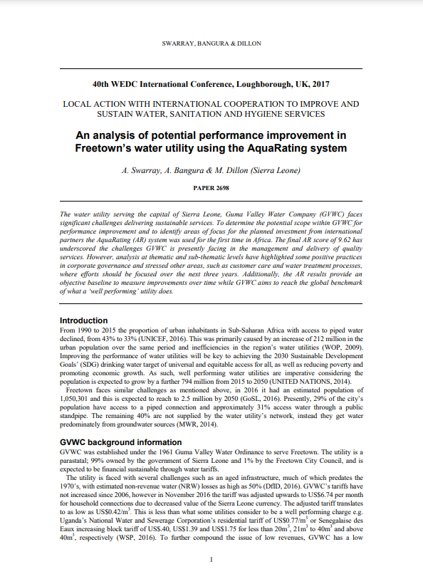 The water utility serving the capital of Sierra Leone, Guma Valley Water Company (GVWC) faces significant challenges delivering sustainable services. To determine the potential scope within GVWC for performance improvement and to identify areas of focus for the planned investment from international partners the AquaRating (AR) system was used for the first time in Africa. The final AR score of 9.62 has underscored the challenges GVWC is presently facing in the management and delivery of quality services.